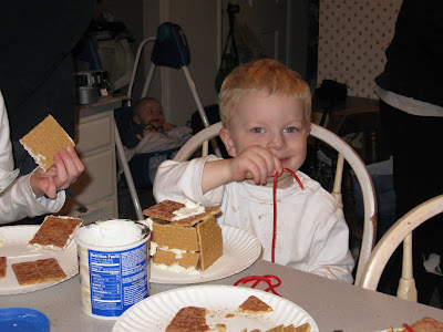 Kim and I actually made REAL gingerbread and cut out all our house pieces. (we learned that you should get the pieces off the cookie sheet pretty fast and not wait for them to cool) Kim was SHOCKED that I actually had molasses in my pantry.